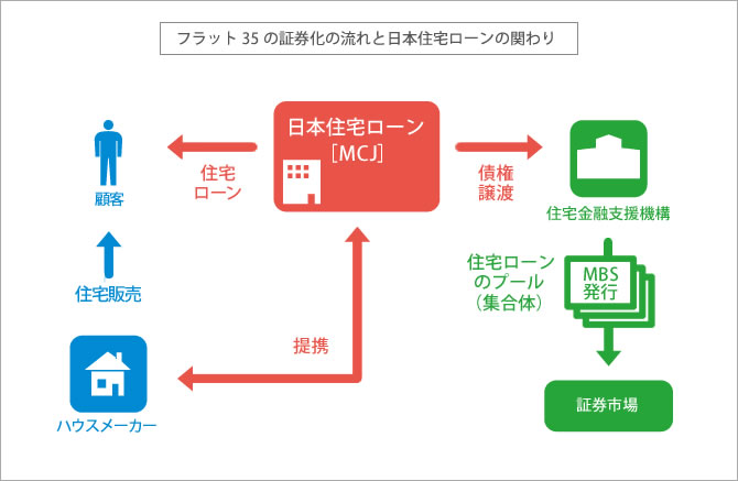 民間金融機関が貸し出した住宅ローン債権を、住宅金融支援機構が買い取ったうえで証券市場から資金調達するしくみの長期固定金利住宅ローンです。