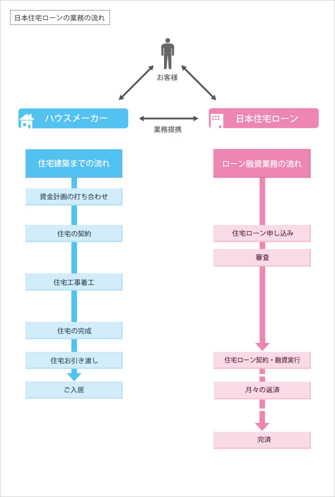 資金調達は住宅金融支援機構が行い、お客様へのご融資やご対応は民間金融機関が行います。また、日本住宅ローンはハウスメーカーと提携しているため、住宅販売現場でスムーズに住宅ローンのお申し込み手続きができるしくみになっています。
